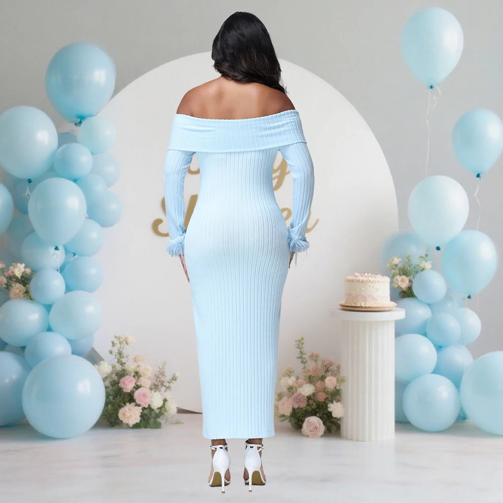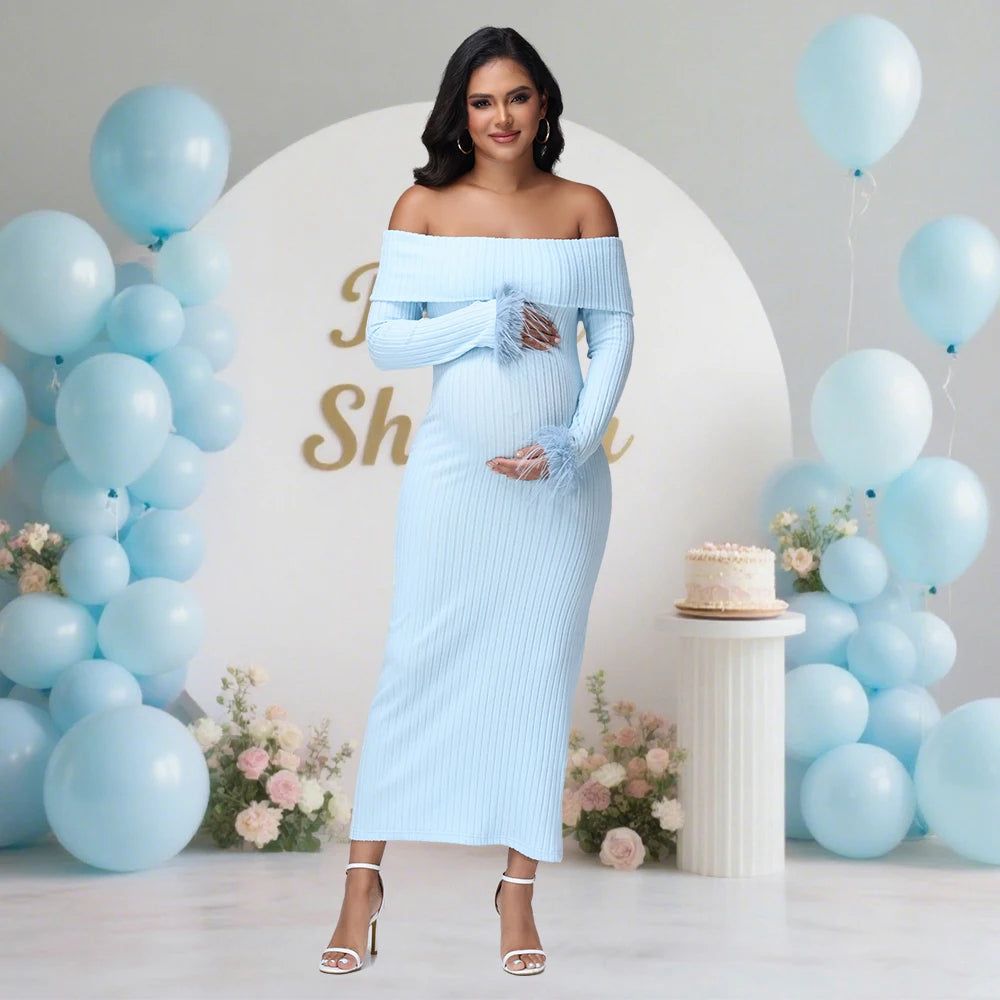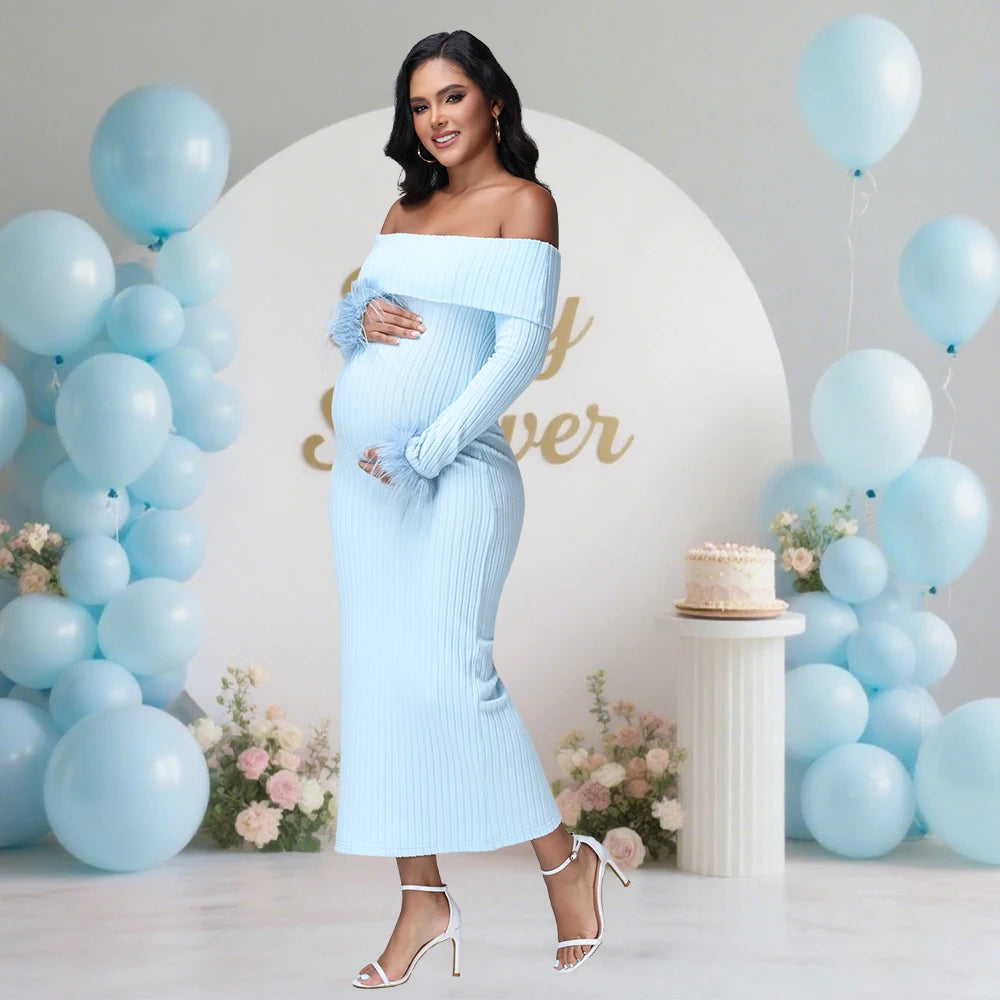 Women’s Off-Shoulder Feather Long Sleeve Maternity Bodycon Maxi Dress